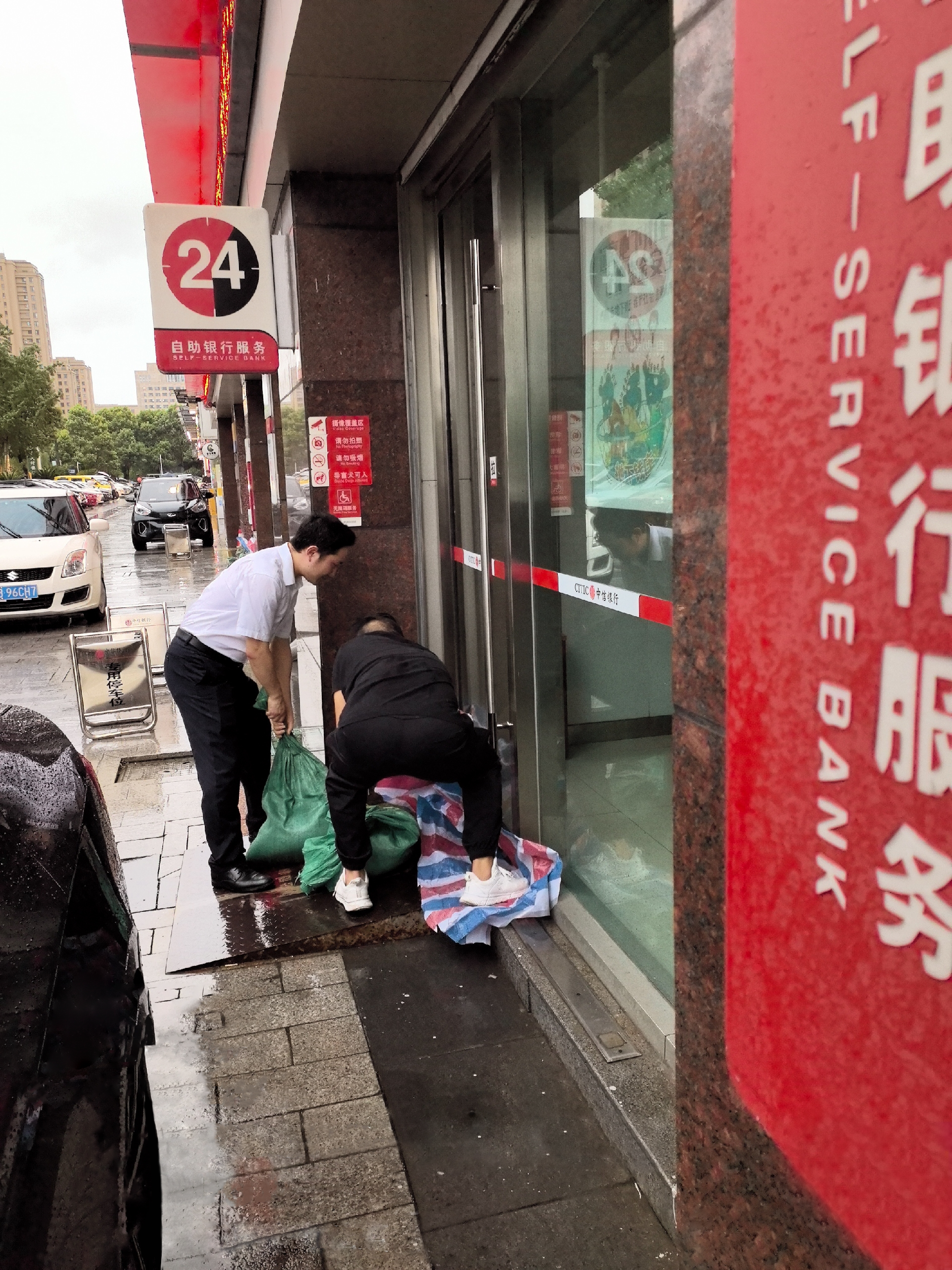 2025年7月30日中信銀行寧波分行江北支行員工在營(yíng)業(yè)網(wǎng)點(diǎn)擺放沙袋,做好防汛應(yīng)急工作。